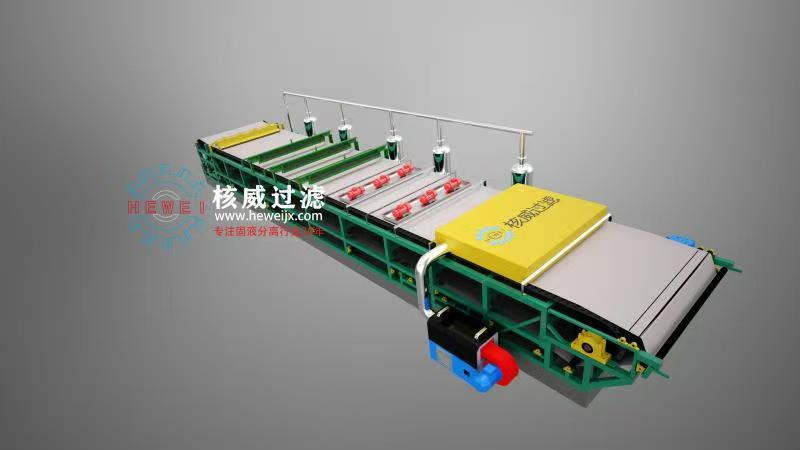 真空帶式過濾機以環形過濾帶為介質,通過真空系統產生負壓實現固液分離,整個過程分為漿料分布、真空過濾、清洗提純、自動卸料四個連續階段,完美適配膨潤土漿料的處理需求。首先,經提純或鈉化改性后的膨潤土漿料通過進料裝置均勻分布在運行的過濾帶上,進料裝置的攪拌機構可防止固體顆粒沉降,避免局部濾層過厚或過薄影響分離效果;隨后濾帶攜帶漿料進入真空吸濾區,真空盒產生的-0.04~-0.08MPa負壓將漿料中的液體快速抽離,膨潤土顆粒被濾帶截留形成連續濾餅,通過多段真空室梯度調壓,實現前端快速脫水、后端深層脫水的效果;若需提升產品純度,清洗區的噴淋裝置可噴灑清水或專用洗滌劑,去除濾餅表面殘留的可溶性雜質,洗滌液單獨收集避免交叉污染;最后濾帶運行至卸料區,通過卸料輥張力變化和彈性刮刀完成自動卸料,清潔后的濾帶循環進入下一輪作業,實現24小時連續運行。